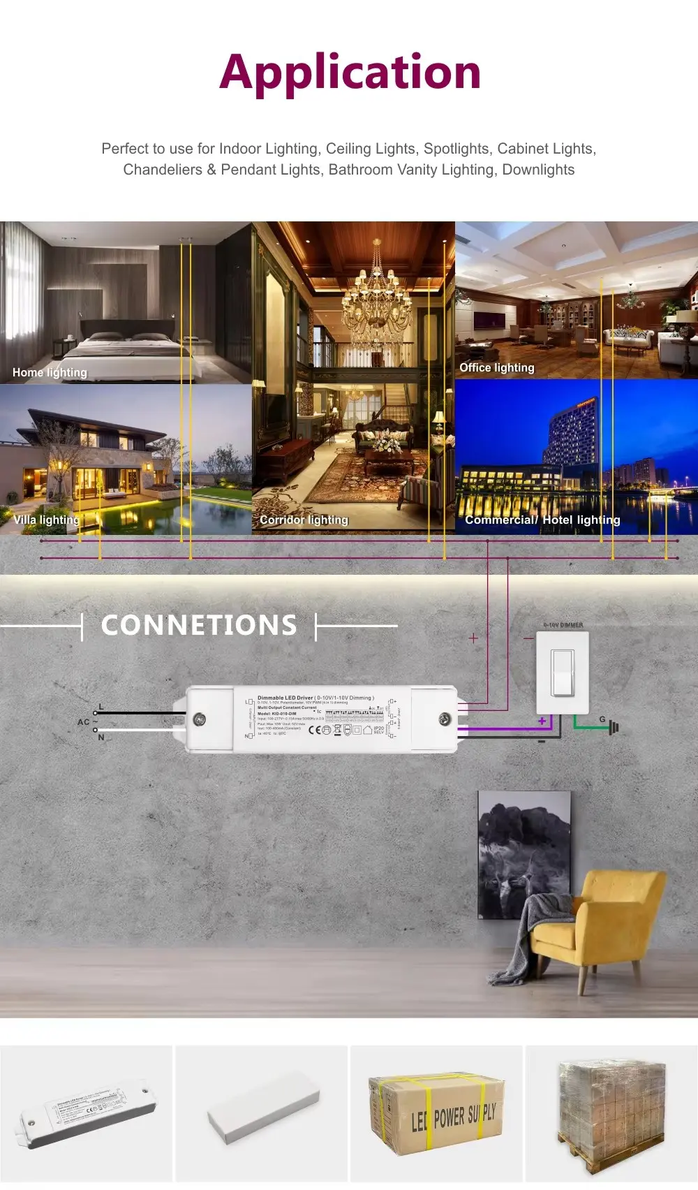 Ta zatemnilnik, izdelan za zagotavljanje dosledne učinkovitosti, podpira širok izhod 3–42 V DC, zaradi česar je združljiv s široko paleto običajnih nizkonapetostnih LED modulov in trakov. Njegova široka sprejemljivost vhodne napetosti zagotavlja stabilno delovanje v različnih električnih okoljih. Zmožen je prenesti obremenitve od 10 W do 60 W in je popolnoma primeren za spekter notranjih aplikacij – od poudarjene razsvetljave, zalivov in delovne razsvetljave pod omaro v domovih do zahtevnejše ambientalne razsvetljave v hotelih, restavracijah in pisarnah.