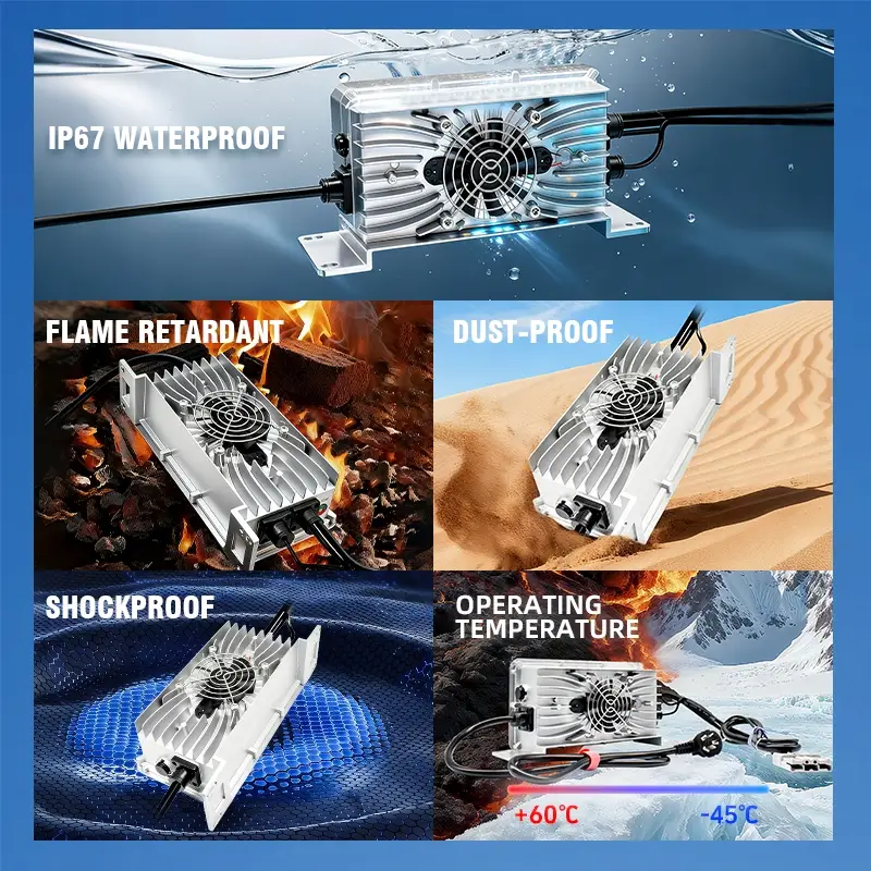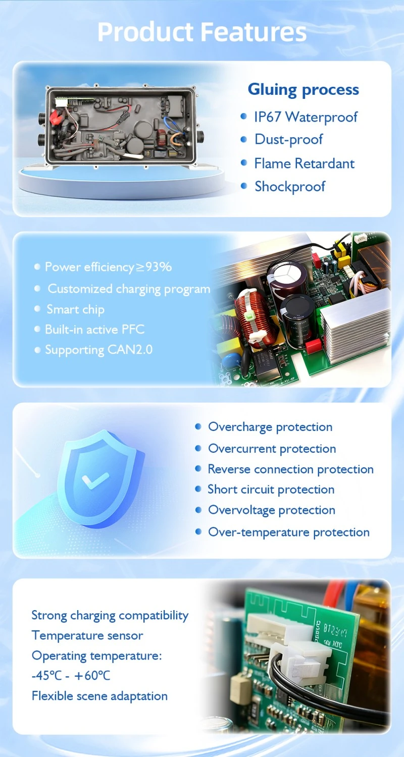 Z nazivno močjo 1,2 kW in izhodnim tokom 25 A lahko ta 1,2 kW vgrajeni polnilnik baterij popolnoma napolni 48 V 100 Ah baterijo v samo 4 urah, kar je 20 % hitreje od navadnih 1000 W polnilnikov. Visoko učinkovita zasnova vezja zmanjša izgubo energije na manj kot 10 %, prihrani energijo in hkrati zagotavlja hitro polnjenje, zaradi česar je idealna za scenarije, ki zahtevajo hitro polnjenje baterije.