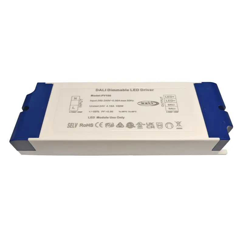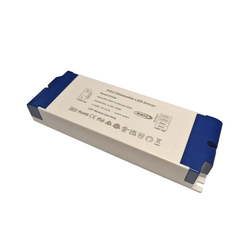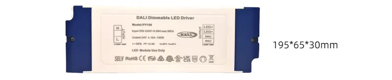 Kot profesionalni proizvajalec gonilnikov DALI s konstantno napetostjo na Kitajskem vam lahko Starwell zagotovi visokokakovostni gonilnik DALI s konstantno napetostjo 100 W za aplikacije z možnostjo zatemnitve 24 V, ki ponuja stabilen izhod 24 V/4,16 A DC z učinkovitostjo do 90 %. Podpira gladko zatemnitev brez utripanja od 100 % do 0,1 % in ima obsežne funkcije zaščite pred kratkim stikom, prenapetostjo, preobremenitvijo in previsoko temperaturo.