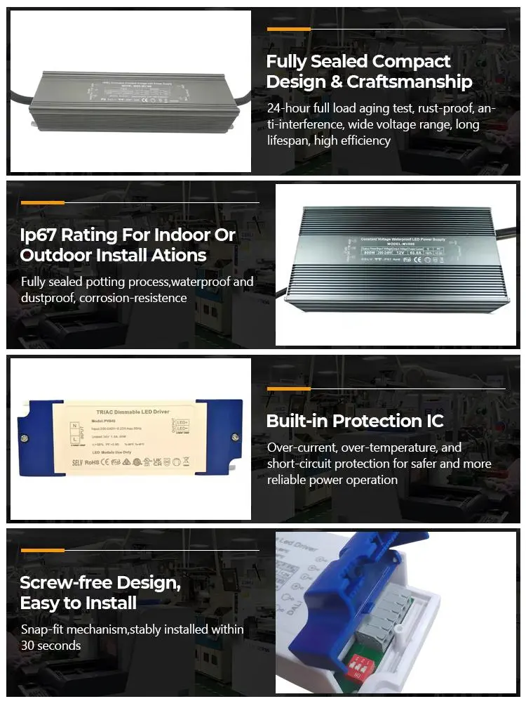 Natančen konstantni tok · Dolgotrajna vzdržljivost: STARWELL gonilnik s triakom s konstantnim tokom, ki ga je mogoče zatemniti, uporablja visoko natančen čip za konstantni tok. Napaka izhodnega toka je ≤ ±3 %, izhodni tok je stabilen pri 1200 mA, globina utripanja pa je <5 %, s čimer se odpravijo težave z utripanjem in slabljenjem svetlobe. Lahko podaljša življenjsko dobo LED svetil za več kot 30 %, njegova neprekinjena življenjska doba pa lahko doseže 50.000 ur, s čimer se znatno zmanjšajo stroški zamenjave in vzdrževanja.