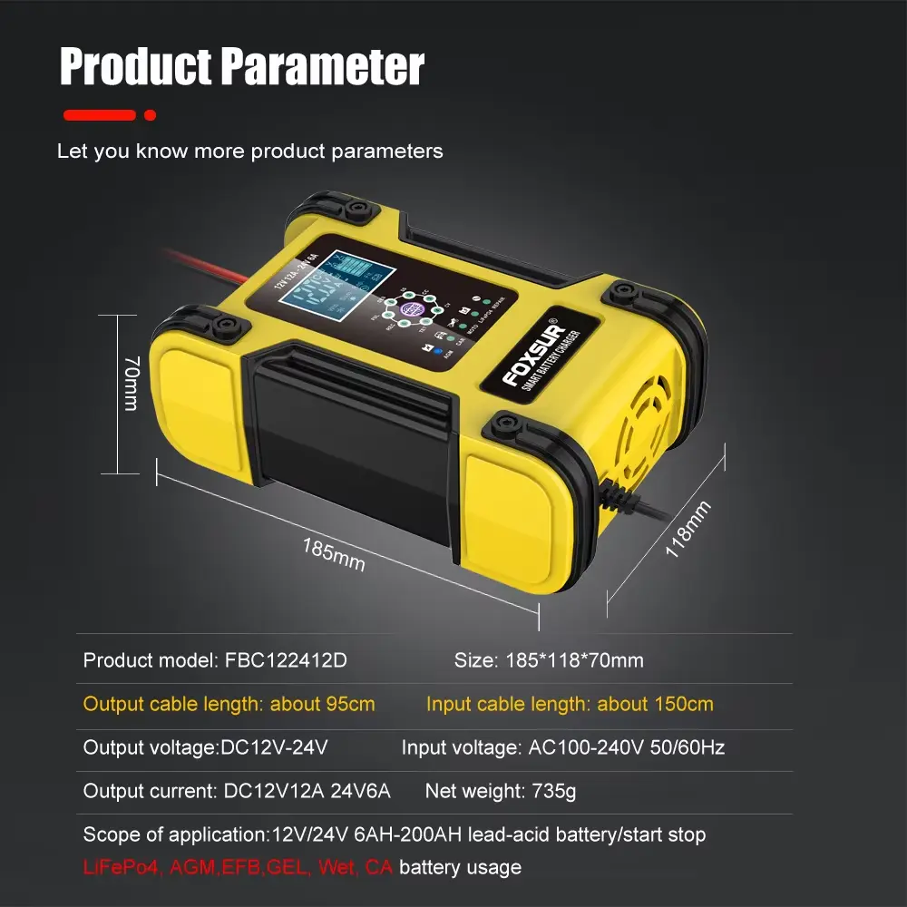 12V 24V 12A 7-segmentni inteligentni polnilnik za svinčeno-kislinske baterije podjetja Starwell je zasnovan tako, da izpolnjuje visoke zahteve polnjenja svinčenih baterij. Kot vodilni proizvajalec in dobavitelj iz Kitajske je Starwell specializiran za zagotavljanje polnilnikov vrhunske kakovosti, ki zagotavljajo izjemno zmogljivost in zanesljivost. Ta polnilnik je opremljen z najsodobnejšimi funkcijami, zaradi katerih je idealna izbira za avtomobilsko, industrijsko in rekreacijsko uporabo.