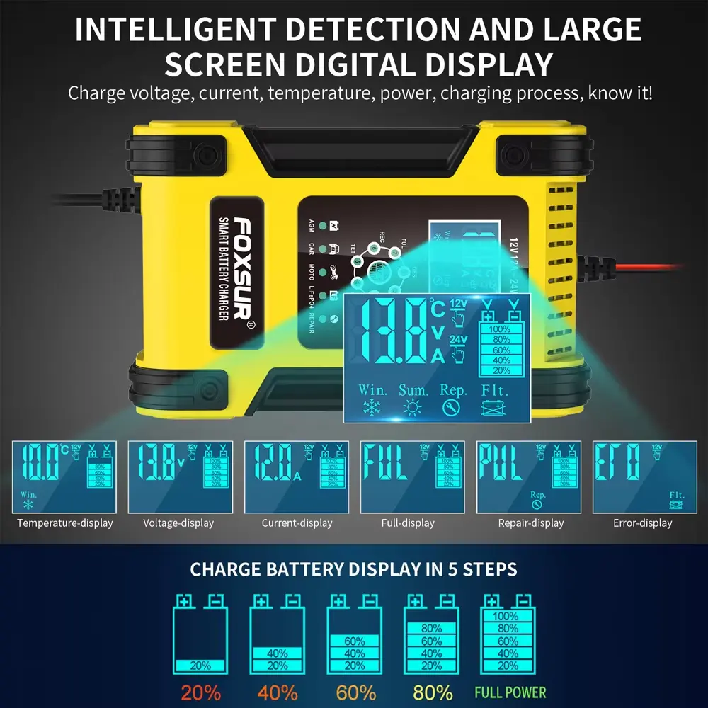 Za razliko od drugih polnilnikov na trgu, 12V 24V 12A 7-segmentni inteligentni svinčeno-kislinski polnilnik baterij ponuja obsežne varnostne funkcije za zaščito vaše baterije in samega polnilnika.