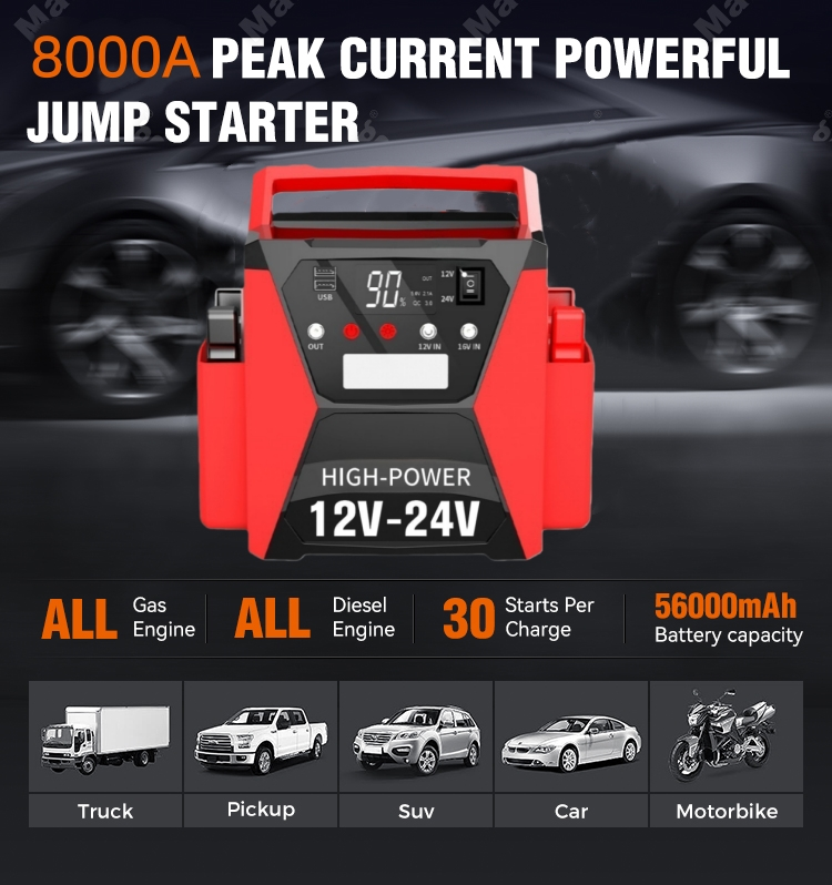 STARWELL predstavlja svoj visoko zmogljiv 12V/24V avtomobilski inteligentni polnilnik za zagon avtomobilov, ki spreminja igro za lastnike vozil, ki iščejo zanesljivost in inteligenco pri vzdrževanju akumulatorja in zagonu v sili. Ta dvonapetostni inteligentni polnilnik baterij, opremljen z 8000 A vrhovnim tokom in 4000 A začetnim tokom, združuje robustno moč s pametno tehnologijo, zaradi česar je primeren za vse plinske motorje in dizelske motorje do 15 L, ki zajemajo avtomobile, tovornjake, avtodome, motorna kolesa, čolne in celo težka gospodarska vozila.