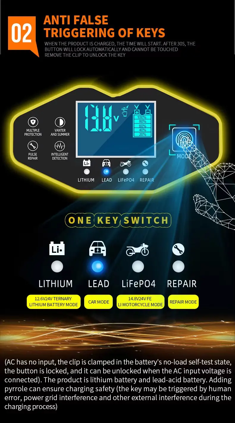 1. Pametno in združljivo ZYX-J40 podpira skoraj vse vrste baterij na trgu, vključno s svinčeno-kislinsko, AGM, gel, EFB, Li-ion in LiFePO₄ (litijev železov fosfat). S širokim razponom zmogljivosti od 2 Ah do 150 Ah deluje z vsem, od majhnih motornih baterij do velikih avtomobilskih baterij.