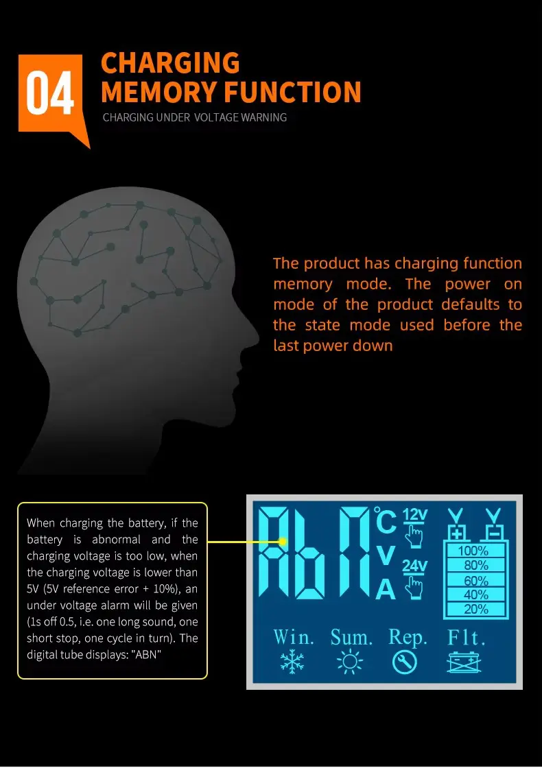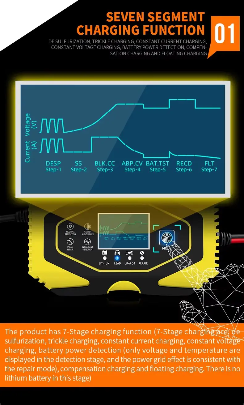 7-stopenjski program polnjenja zagotavlja optimalno nego baterije: razžveplanje, mehak zagon, množično polnjenje, absorpcijo, analizo, obnovo in vzdrževanje plovca. Ti stopnji delujeta skupaj, da podaljšata življenjsko dobo baterije, obnovita sulfatizirane baterije in preprečita prekomerno polnjenje.