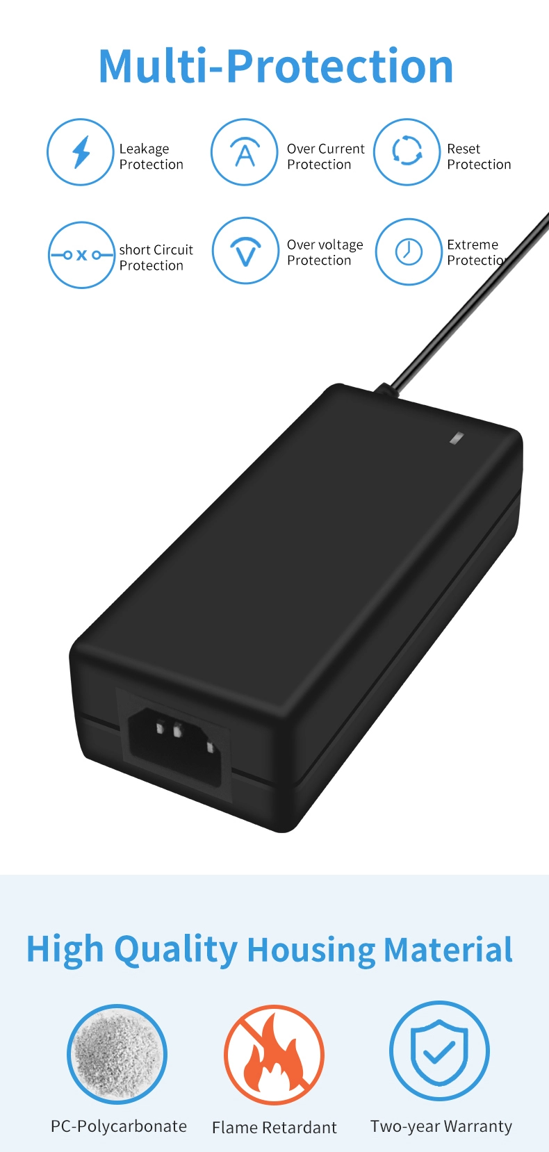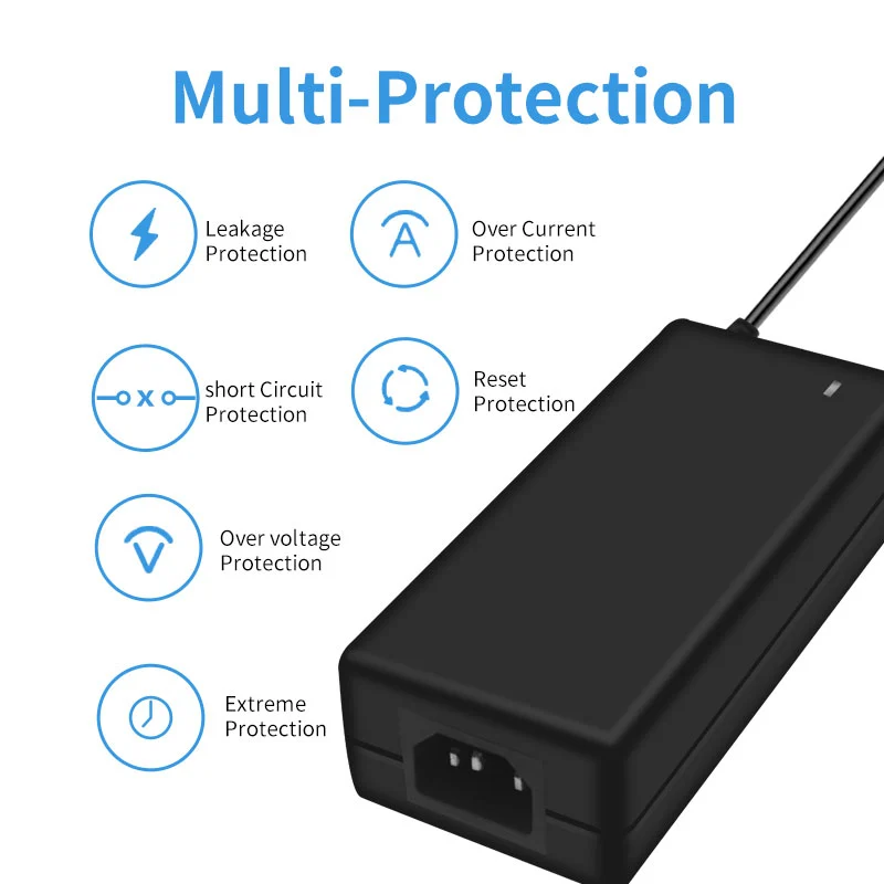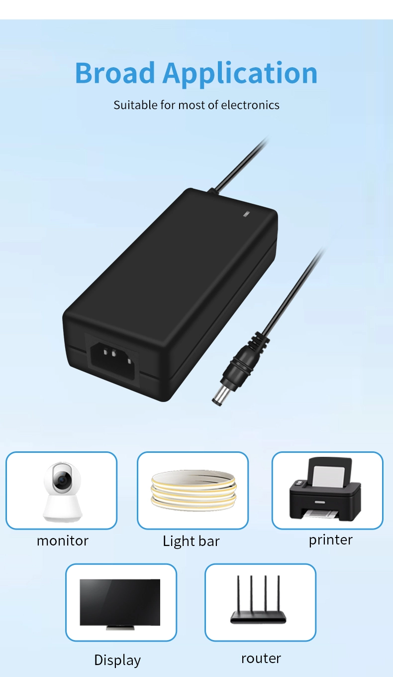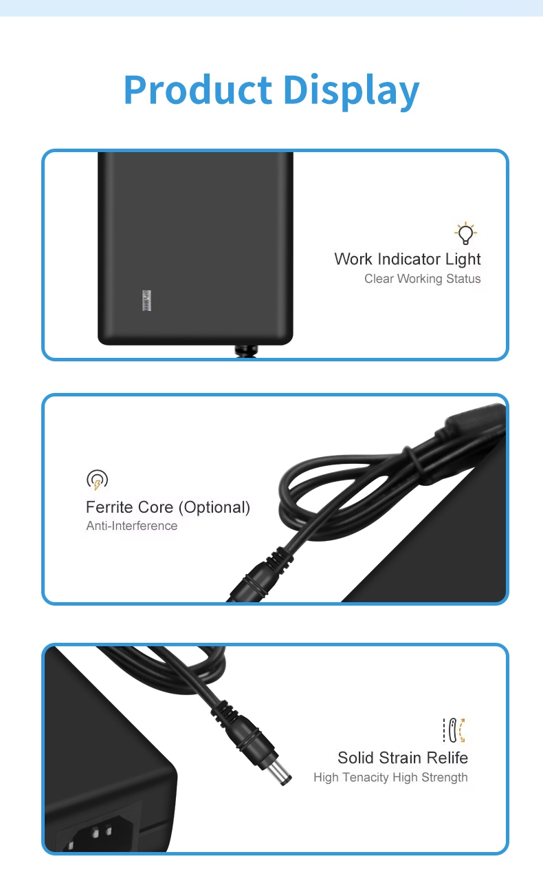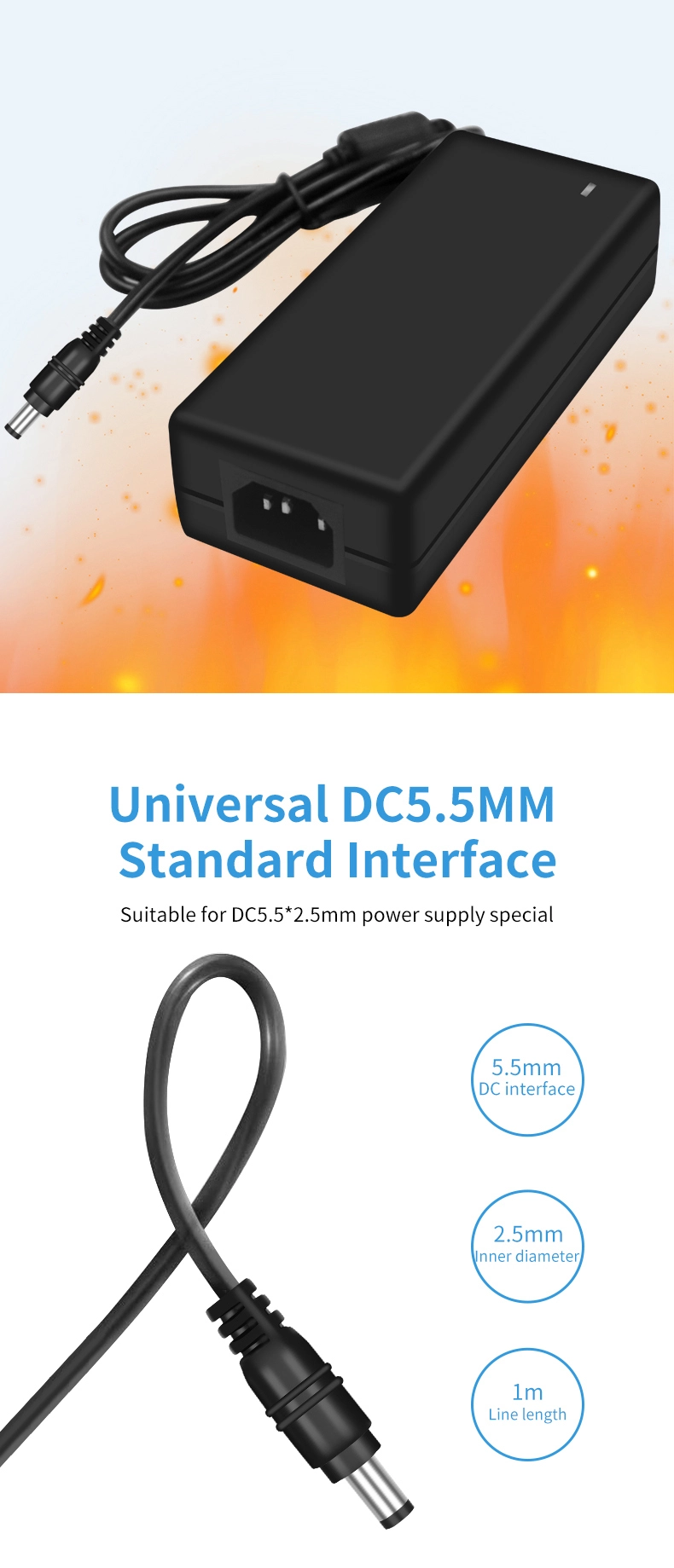 AC 100-240V široko napetostni vhod je združljiv z električnimi omrežji v več kot 100 državah po vsem svetu. 1,5 m podaljšan izhodni kabel (premer 1,0 mm²) skupaj z 180° vrtljivim priključkom DC se prilagaja različnim scenarijem namestitve. S kompaktno velikostjo samo 120 × 60 × 30 mm je 35 % manjši od tradicionalnih adapterjev enake moči in tehta le 280 g – kar izboljša prenosljivost za 50 %.