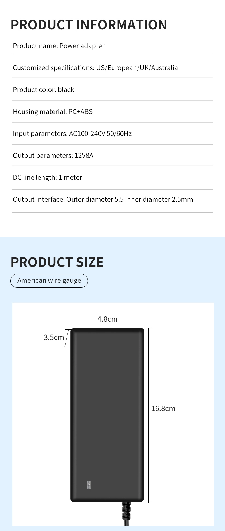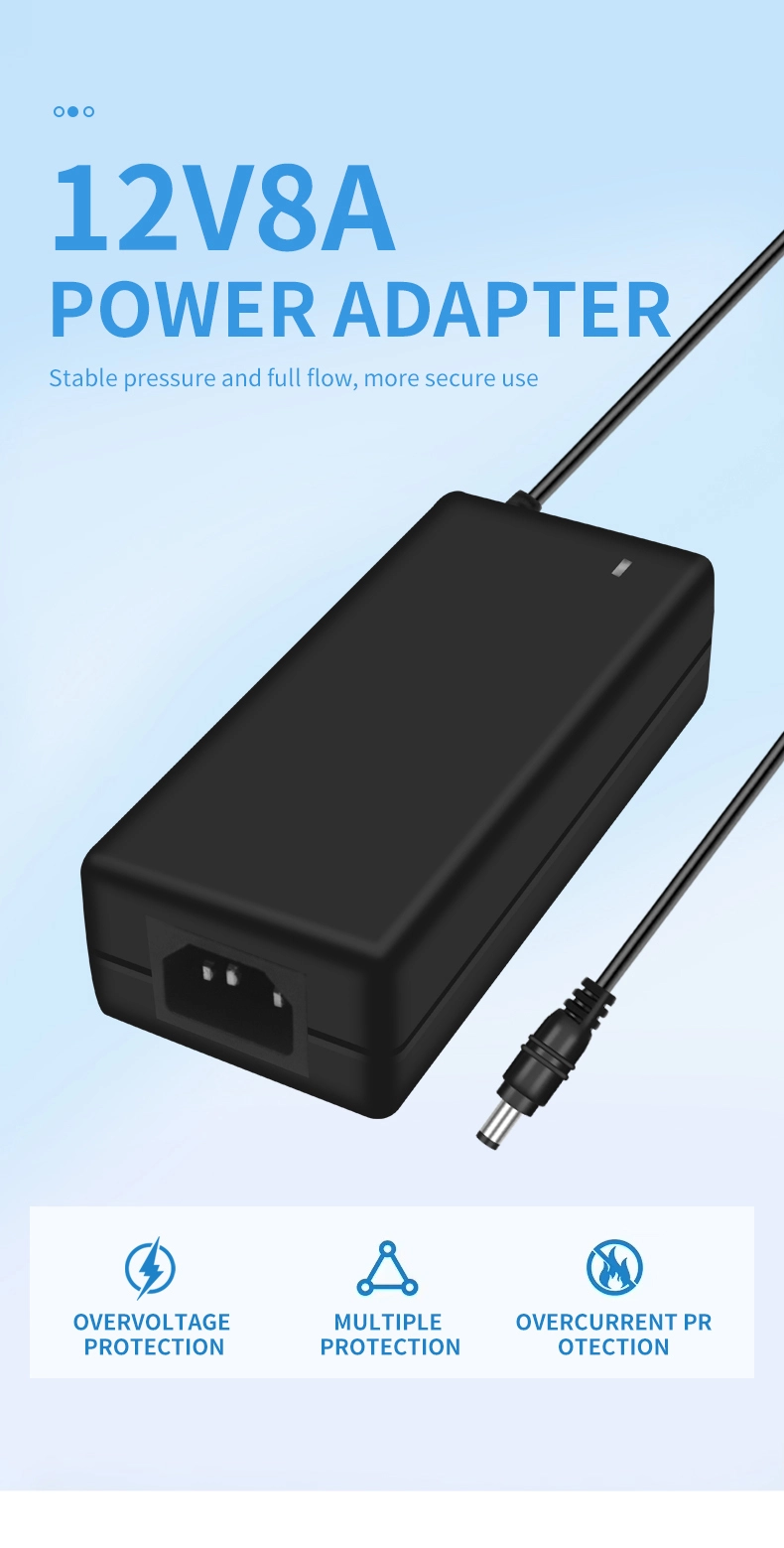 Z nazivno močjo 96 W se izhodni tok napajalnika 96 W stabilizira na vrhuncu 8 A, natančnost napetosti pa je nadzorovana v območju ±5 % (napetost brez obremenitve: 12,1 V; napetost pri polni obremenitvi: 11,8 V). Lahko zadosti hkratnim potrebam po napajanju več naprav (npr. 2 vzporedni napravi 48 W). Izhodni kabel s čistim bakrenim jedrom zagotavlja padec napetosti ≤0,3 V in ohranja neoslabljeno delovanje med prenosom visokega toka.