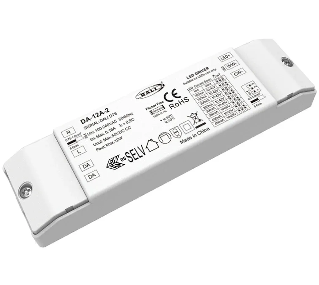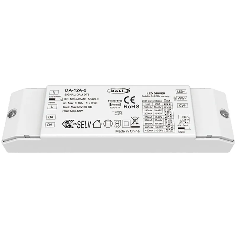Visokokakovosten gonilnik LED z možnostjo zatemnitve 12 W DALI CW WW CCT tovarne STARWELL je zasnovan za vrhunske, nastavljive aplikacije bele razsvetljave, ki zahtevajo natančen nadzor in zanesljivo delovanje. Ta kompakten, visoko učinkovit gonilnik zagotavlja stabilen izhod konstantnega toka 12 W (12 V, 1000 mA), kar zagotavlja optimalno delovanje in dolgo življenjsko dobo povezanih modulov LED. Naš visokokakovosten 12 W DALI CW WW CCT zatemnjen gonilnik LED ima prefinjen vmesnik Dual DALI, ki podpira zatemnitev DALI-2 (DT8) za brezhibno 10%-100% gladko zatemnitev in neodvisno nastavitev CCT (Correlated Color Temperature) od 2700K tople bele do 6500K hladne dnevne svetlobe. Z impresivno tipično učinkovitostjo >90 % in visokim faktorjem moči (PF>0,9) zmanjšuje izgubo energije in obremenitev omrežja. V kompaktnem ohišju z oceno IP20 ponuja delovanje pri polni obremenitvi v širokem temperaturnem območju od -20 °C do +50 °C, zaradi česar je vsestranska in inteligentna napajalna rešitev za arhitekturno, komercialno in vrhunsko stanovanjsko razsvetljavo.
