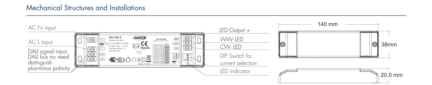 Ta gonilnik LED z možnostjo zatemnitve, ki je v kompaktnem ohišju IP20, poenostavlja namestitev tudi v zaprtih prostorih, kot so profili LED ali ohišja svetilk. Z združevanjem izhoda konstantnega toka, širokega uglaševanja CCT in združljivosti z industrijskim standardom DALI-2 služi kot idealen gonilnik za prihodnost za nastavljive bele svetilke navzdol, linearne napeljave in arhitekturno razsvetljavo – ki se brezhibno integrira v sodobne ekosisteme pametne razsvetljave kot vsestranski gonilnik LED s konstantnim tokom DALI CCT zatemnitve.