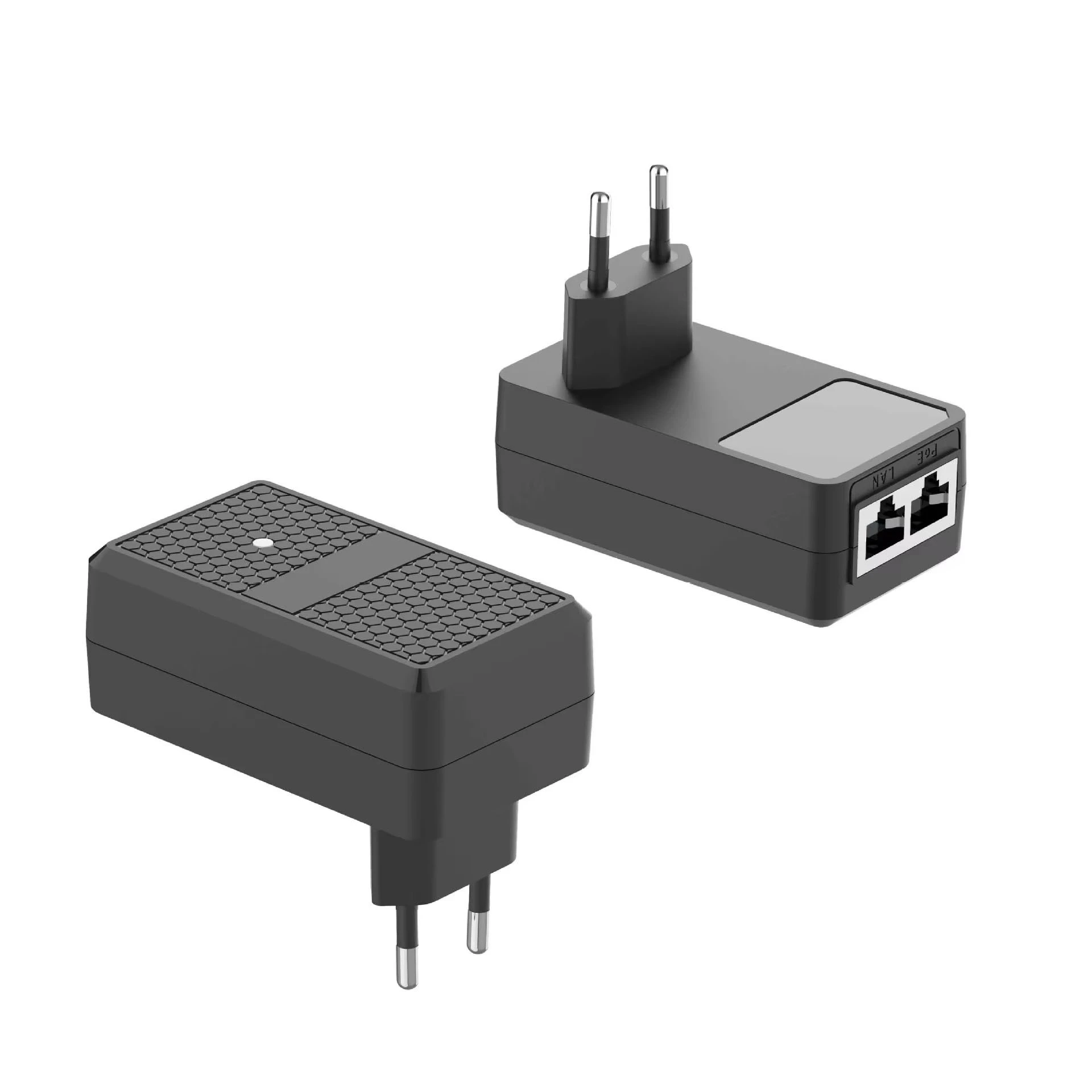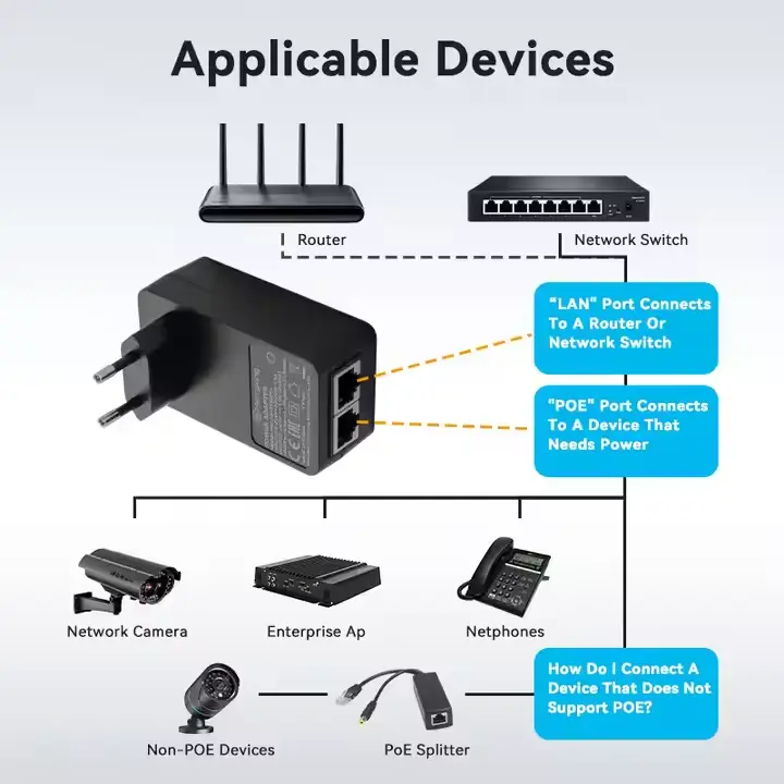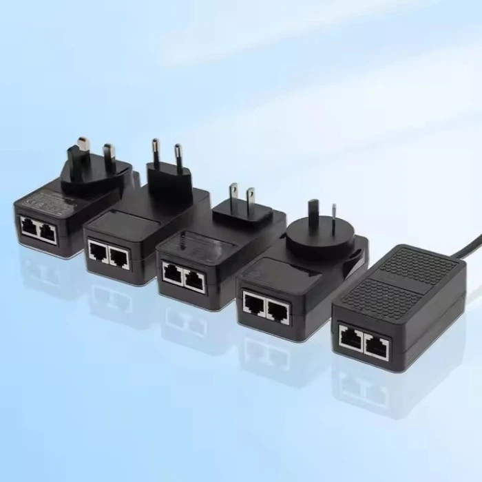 12 W stenski zamenljivi vtični injektor PoE je integrirana omrežna napajalna naprava, ki združuje napajalnik in pasivni injektor PoE v eno samo kompaktno enoto. Za razliko od tradicionalnih nastavitev PoE, ki zahtevajo tako napajalnik kot modul injektorja, ta zasnova poenostavlja namestitev, saj omogoča neposredno montažo naprave na stensko vtičnico.