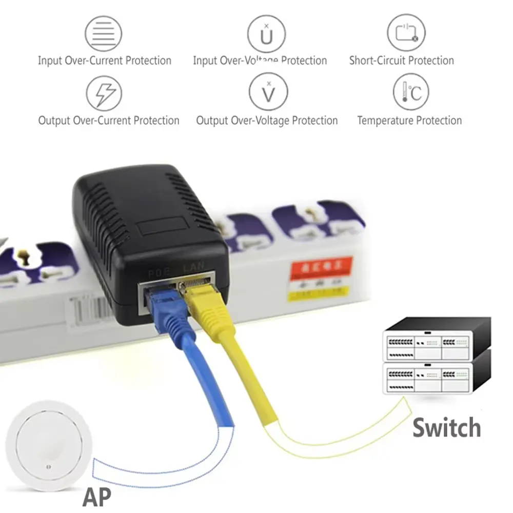 Injektor, opremljen z vmesnikom 10/100/1000 Mbps RJ45, zagotavlja hiter prenos podatkov in podpira 2,5G Ethernet združljivost, s čimer izpolnjuje zahteve sodobnih HD nadzornih sistemov in brezžičnih omrežij.
