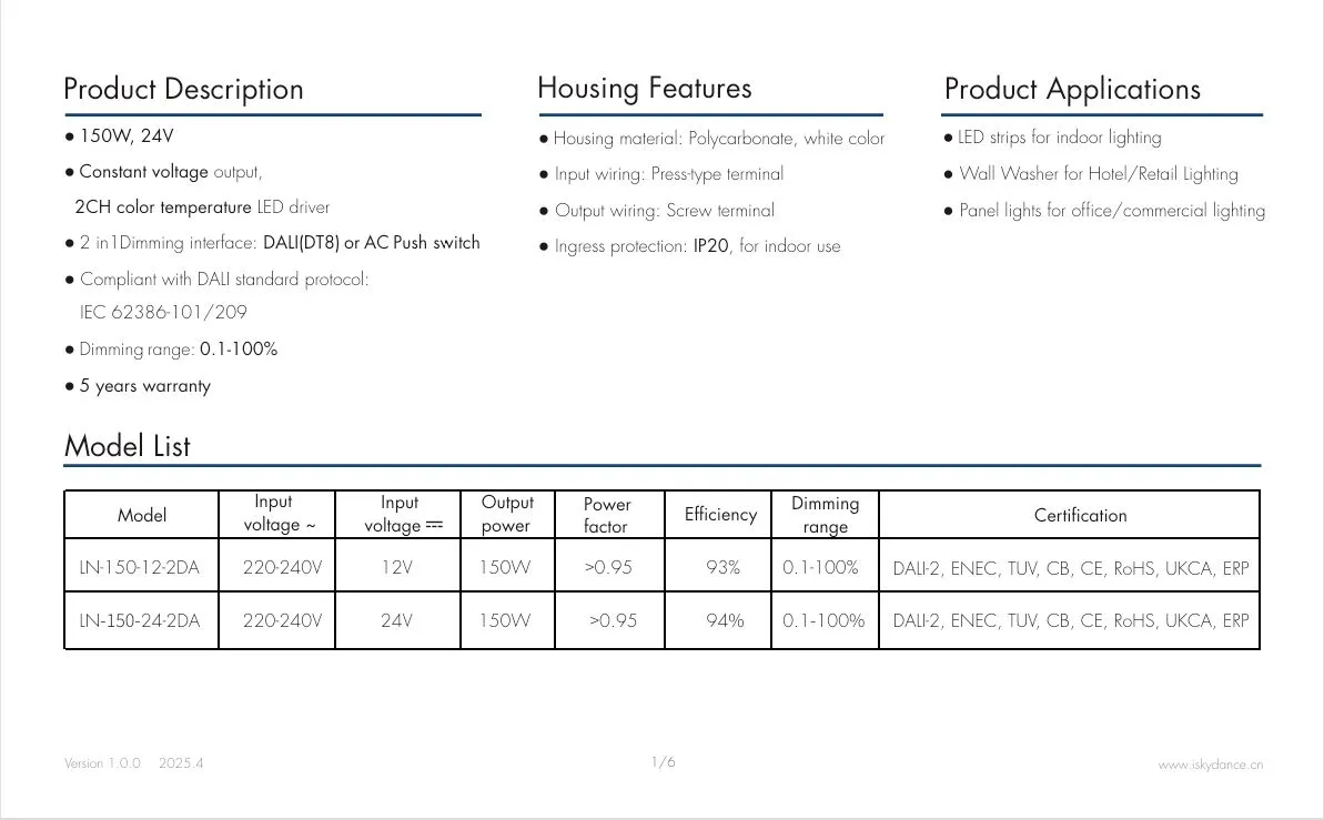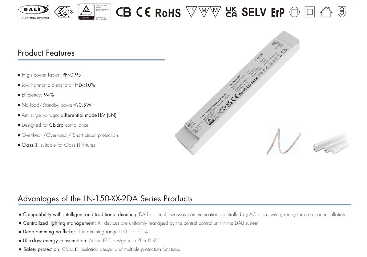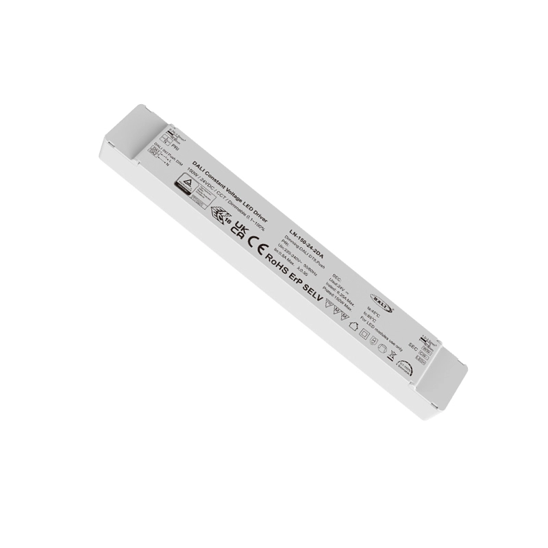 Gonilnik LED s konstantno napetostjo 150 W 24 V tovarne Starwell podpira neodvisno prilagoditev dvojne barvne temperature DALI CCT, kar omogoča natančen nadzor svetlosti in barvne temperature za izpolnjevanje različnih potreb po osvetlitvi. Izdelek se ponaša z 91-odstotno visoko učinkovitostjo, faktorjem moči (PF) > 0,95, nizkim harmoničnim popačenjem (THD) < 10 % in izjemno nizko porabo energije v stanju pripravljenosti (≤ 0,5 W), kar ustreza standardom energetske učinkovitosti CE-Erp.