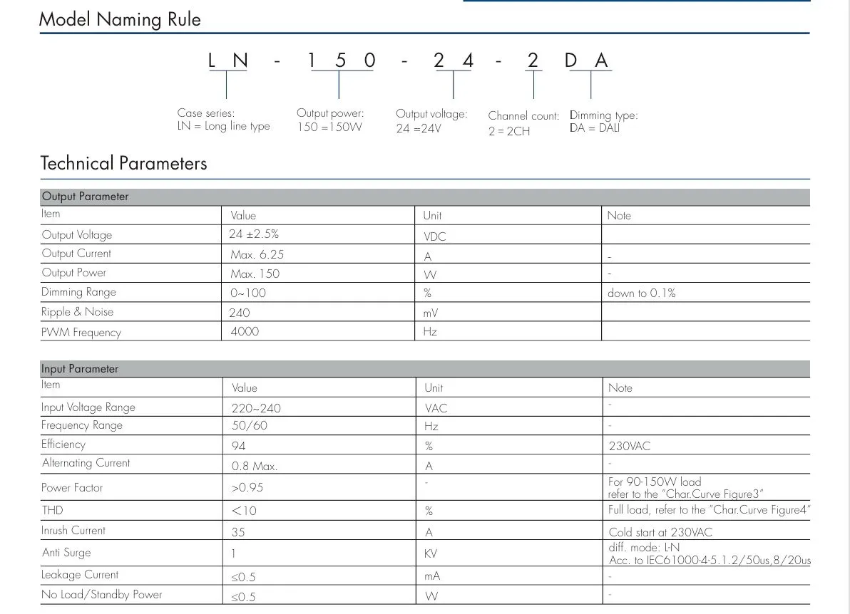 Dvojna izolacija: 150 W 24 V DALI CCT LED gonilnik s konstantno napetostjo je sestavljen iz osnovne izolacije in dodatne izolacije, ki tvorita dve neodvisni plasti zaščite izolacije, tudi če ena plast odpove, lahko druga plast še vedno prepreči električni udar