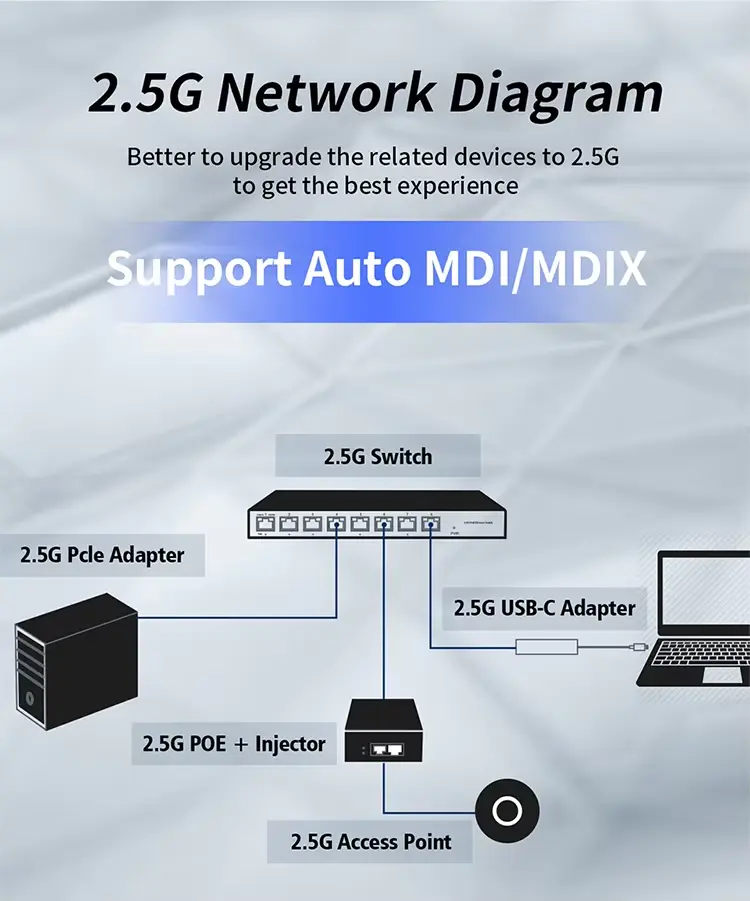 Ostanite pred krivuljo pasovne širine s podporo za podatkovne hitrosti 2,5 Gbps, ki je popolnoma združljiva z napravami 10/100/1000 Mbps.