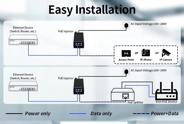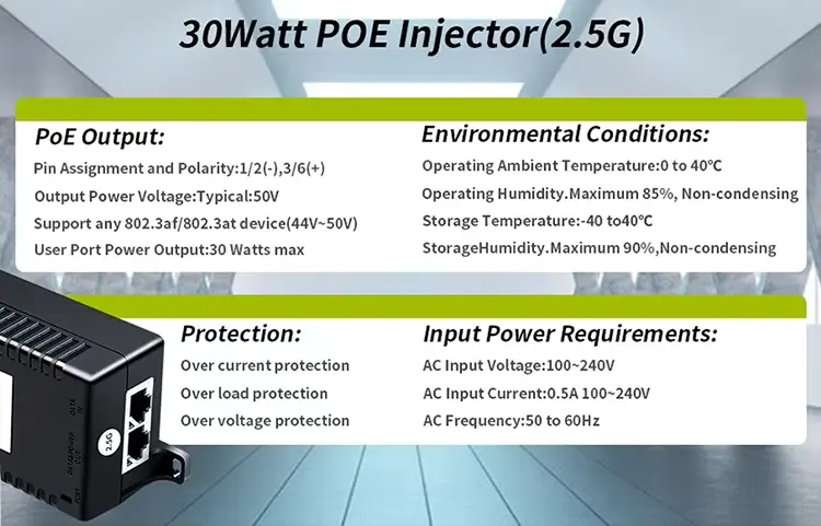 Vzdržljiva konstrukcija: Visokozmogljiv 30 W Poe injektor ima brezšivno ultrazvočno lepljenje za boljšo zaščito pred prahom in fizičnim stresom.