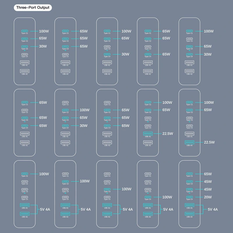 Izhod USB C1/C2/C3/C4: 5V/3A 9V/3A 12V/3A 15V/3A 20V/5A (največ 100 W) USB A1/A2: 5V/3A 9V/2A 12V/1,5A (največ 18W) |