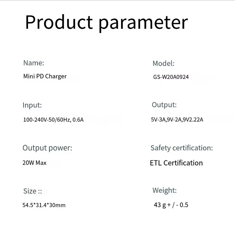 Specifikacije polnilnika PD za japonsko različico 20 W: