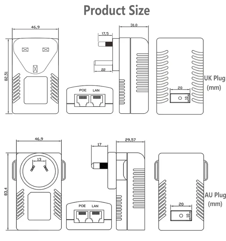 Kompaktna struktura stenske vtičnice omogoča neposredno uporabo s standardnimi električnimi vtičnicami, brez dodatnih nosilcev ali ožičenja. Ta 24V 1A 48V 0,5A POE injektor prihrani prostor in poenostavi napeljavo kablov, zaradi česar je idealna izbira za dom, pisarno, trgovino in majhne nadzorne sisteme.