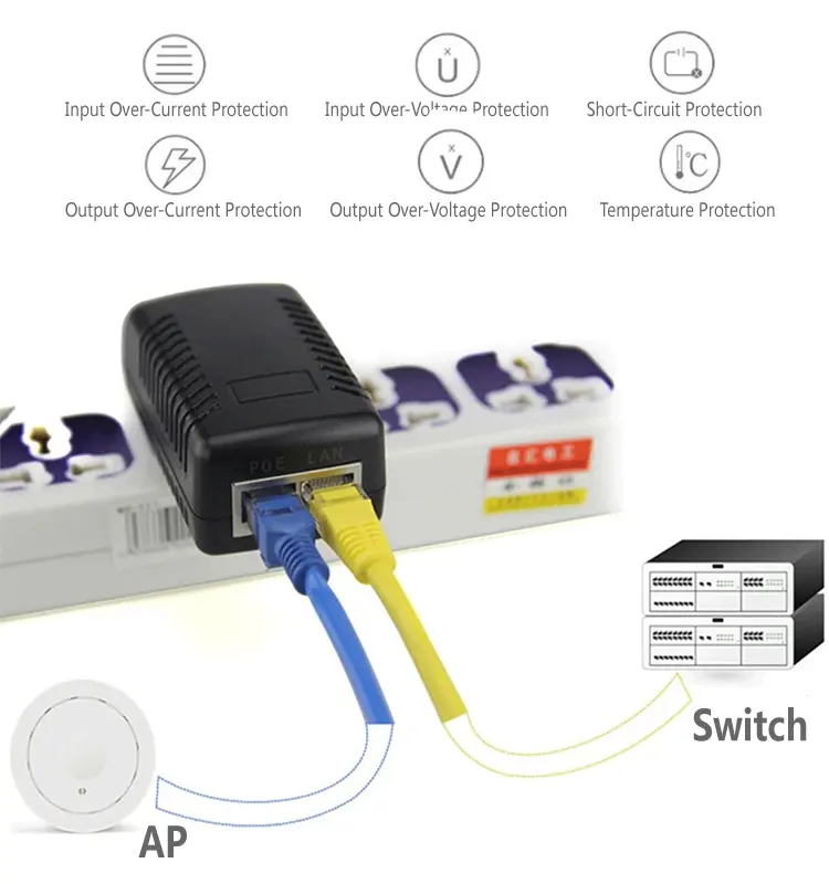 2-portni POE injektor zagotavlja stabilno napetost in tok z nizkim valovanjem, kar zagotavlja dolgoročno stabilno delovanje. Široka vhodna napetost 100–240VAC se prilagaja globalnim električnim omrežjem. Vgrajena zaščita pred prenapetostjo, previsokim tokom, kratkim stikom in previsoko temperaturo ščiti tako injektor POE z dvojnimi vrati kot povezano opremo.