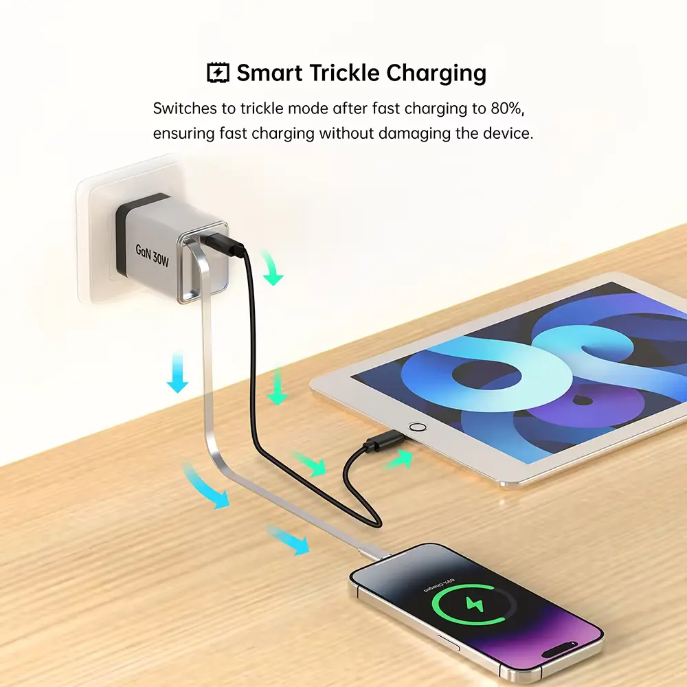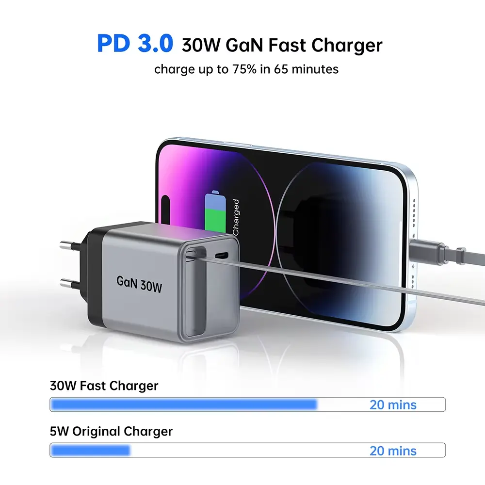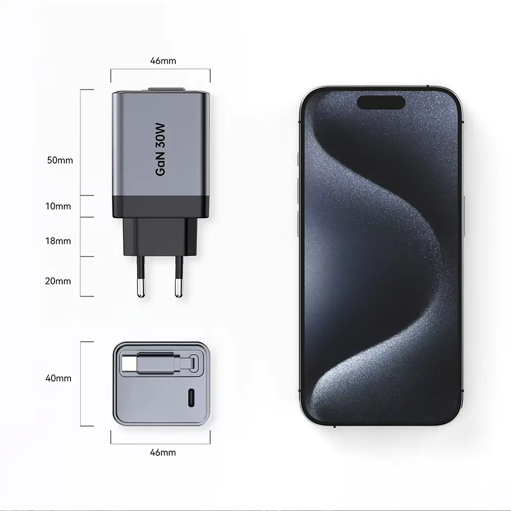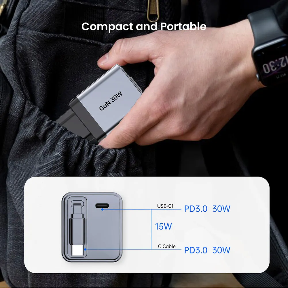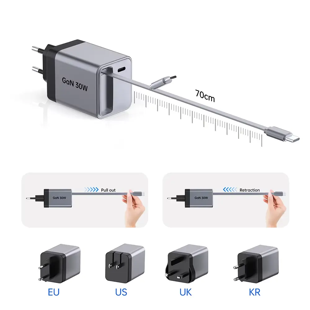 Izjemno lahek hitri polnilnik z močjo 30 W in izvlečnim kablom tipa C omogoča enostavno prenašanje. Je odlična izbira za dom, pisarno ali potovanje.