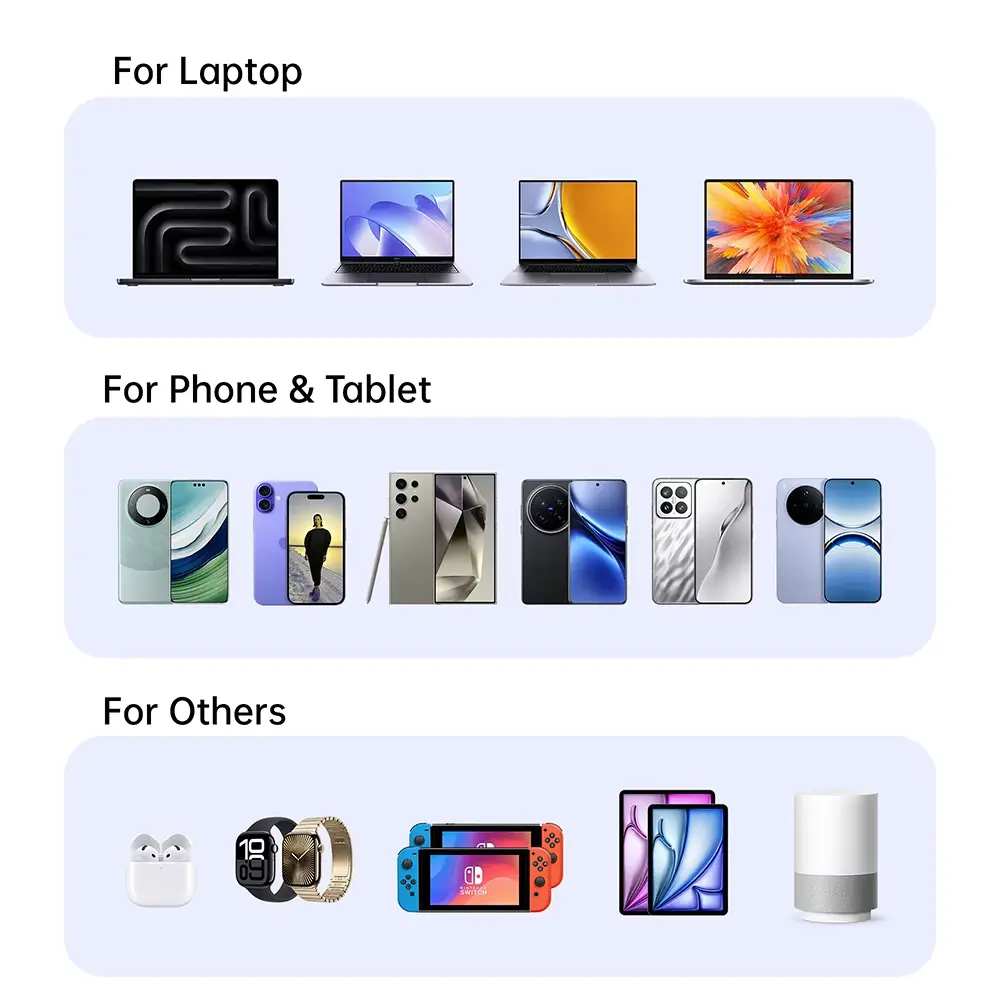 Združljiv z napravami USB-C, vključno z mobilnimi telefoni, slušalkami in igralnimi dodatki. Samodejno zazna potrebe naprave za varno in učinkovito polnjenje. 4. Prenosljivost, pripravljena na potovanja