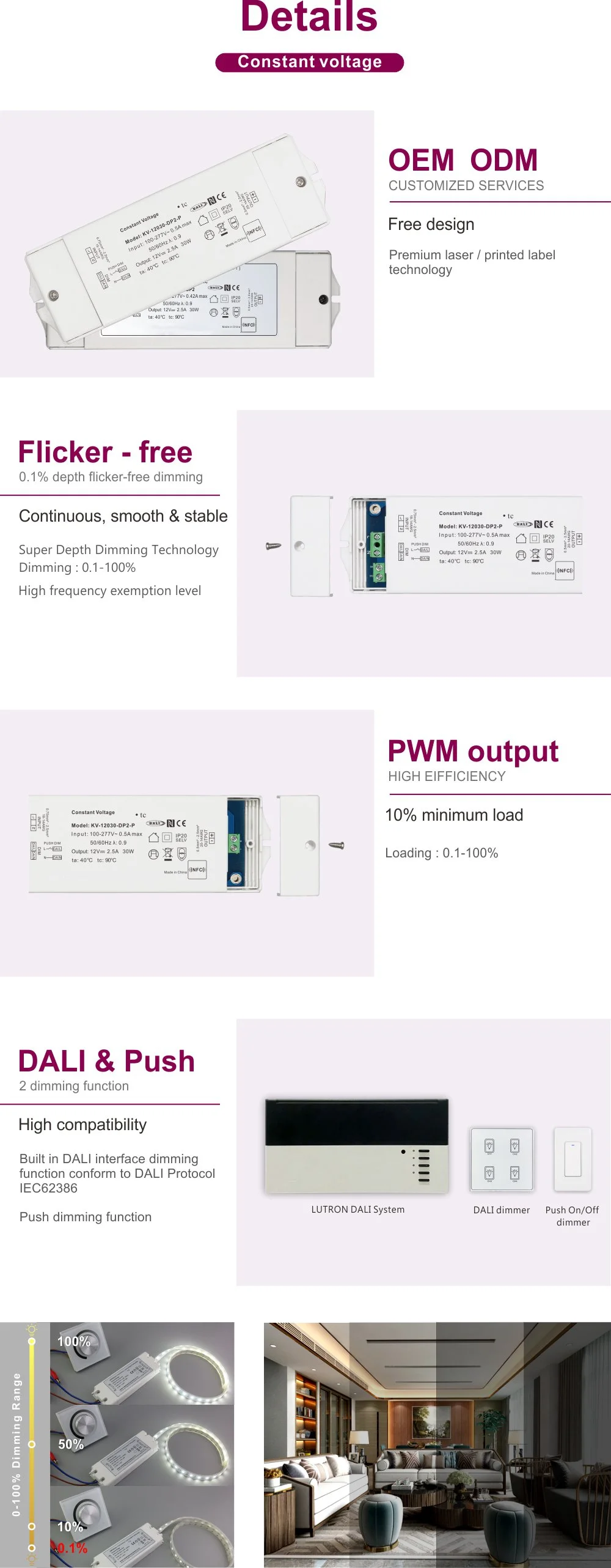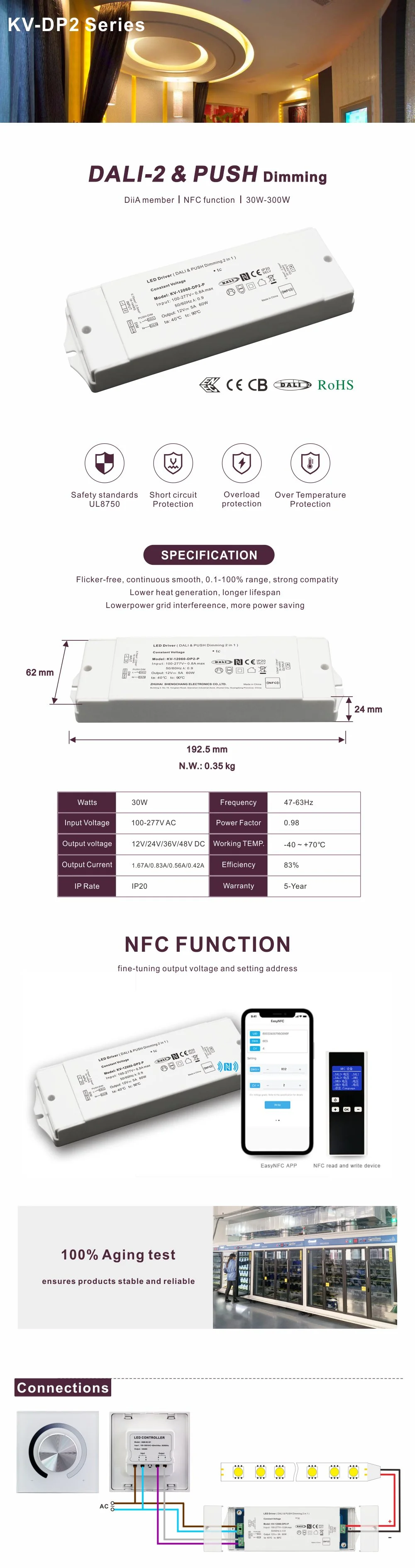 Poleg zmogljive funkcije DALI ta gonilnik ponuja izjemno izkušnjo zatemnitve. Doseže svilnato gladek učinek NFC Dimming Smooth No Flicker, ki popolnoma odpravi vidno utripanje in tresenje tudi pri nizkih ravneh svetlosti, učinkovito ščiti vid in ustvarja udobno in zdravo svetlobno okolje. Njegova široka zasnova AC vhodne napetosti (100–265 V vhod) omogoča prilagajanje napetostnim nihanjem v električnih omrežjih po vsem svetu, kar zagotavlja stabilno delovanje v različnih regijah.