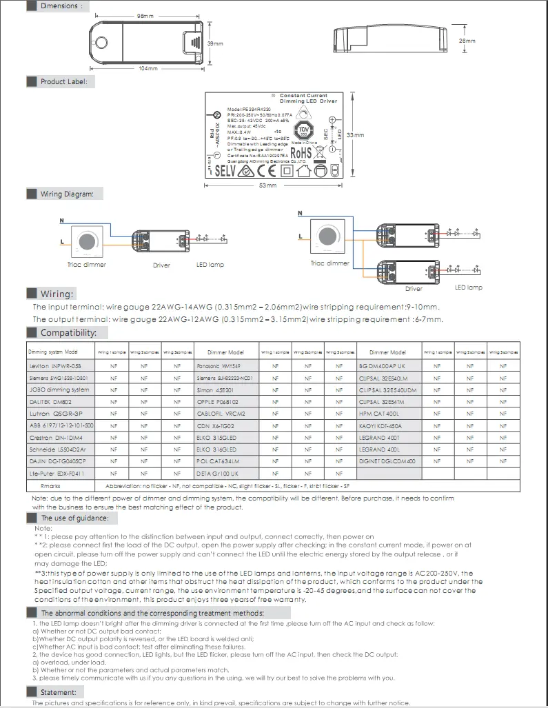 Visokokakovosten gonilnik LED za zatemnitev s triakom PE294R 42V max 200ma s konstantnim tokom je eden od potapljačev LED za zatemnitev s konstantnim tokom, ki ga je razvil kitajski proizvajalec Starwell, z visokim faktorjem moči, visoko učinkovitostjo, visoko natančnostjo, uporabo učinkovitega stabilnega krmilnega čipa stikala z nizko izgubo in visoko zmogljivimi komponentami, ki mu zagotavljajo nizko raven hrupa, dolgo življenjsko dobo in druge značilnosti.