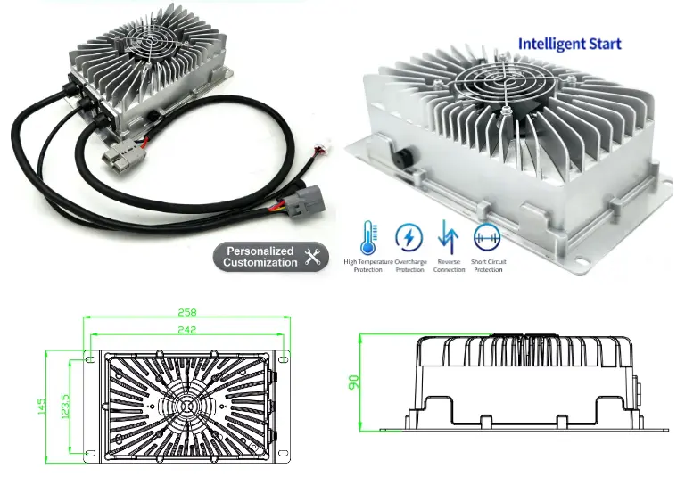 Polnilnik 480 W OBC 24 V 15 A je popoln za električne avtomobile, motorna kolesa, vozila za ogled znamenitosti, viličarje, pomorska plovila in industrijske stroje. Zaradi njegove trpežne zasnove in široke podpore za baterije je prednostna izbira za proizvajalce, dobavitelje in tovarne, ki želijo nadgraditi sisteme za polnjenje električnih vozil z zanesljivim delovanjem.