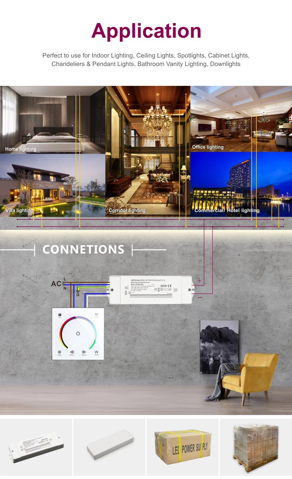 Ne glede na to, ali gre za LED panelne luči v pisarnah, LED downlighte v nakupovalnih središčih, skrite svetlobne trakove na hotelskih hodnikih ali poudarjeno osvetlitev v domačih prostorih, je ta gonilnik idealna izbira. Kompaktno ohišje iz aluminijeve zlitine s polno izolacijo zagotavlja odlično upravljanje toplote in dolgoročno stabilno delovanje. Vgrajena več zaščitnih vezij za prenapetost, previsok tok, kratek stik in pregrevanje zagotavlja celovito varnostno zaščito za celoten sistem razsvetljave.