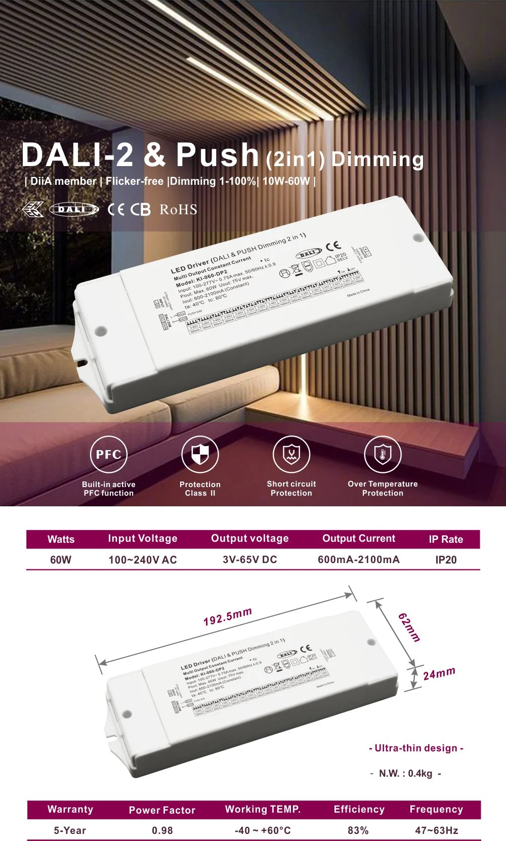 Kot gonilnik s konstantnim tokom 60 W uporablja napredno tehnologijo nadzora konstantnega toka z zaprto zanko, da zagotovi visoko stabilnost izhodnega toka (tipična vrednost je 700 mA, ki jo je mogoče prilagoditi glede na zahteve strank glede modula LED). Ta zasnova učinkovito preprečuje oslabitev svetlobe ali barvno odstopanje, ki ga povzročajo trenutna nihanja v LED, kar v osnovi zagotavlja dolgoročno svetlost in življenjsko dobo svetilk. Zaradi njegovega širokega vhodnega območja napetosti in konstantnega tokovnega izhoda je popolnoma združljiv z različnimi specifikacijami LED downlightov, reflektorjev, panelnih luči, linearnih luči in modulov svetlobnih trakov.