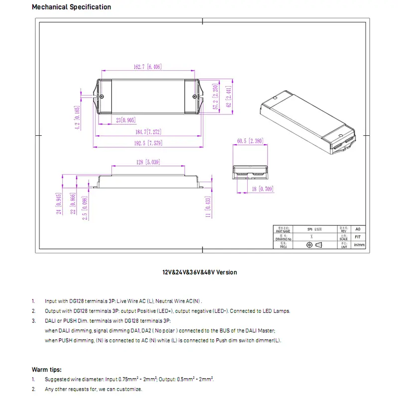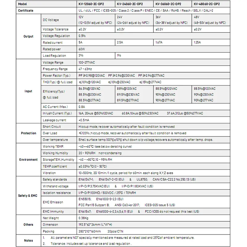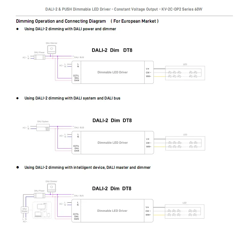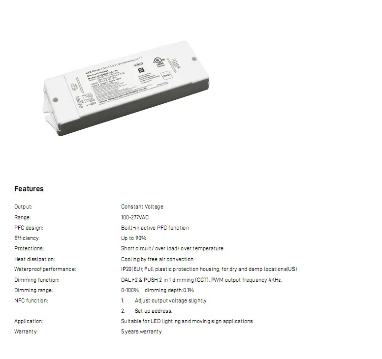 Sprejema digitalno zatemnitev DALI, podpira 0,1-100-odstotno gladko zatemnitev brez utripanja in natančno nastavitev CCT od 2700K do 6500K, pri čemer ohranja svetlost dosledno med premiki barvne temperature. Vgrajeni aktivni PFC poveča učinkovitost do 88 % z nizko porabo energije brez obremenitve. Ima zaščito pred mehkim zagonom, prenapetostjo, prevelikim tokom in kratkim stikom, kar zagotavlja varno delovanje.