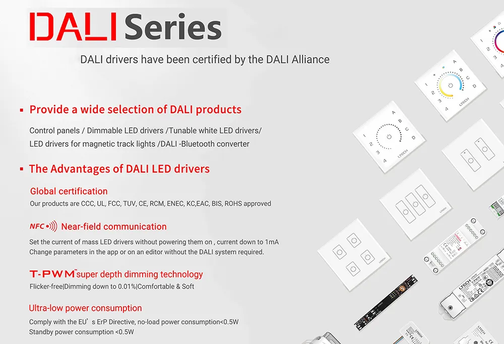 Napredni nadzor zatemnitve DALI – Omogoča digitalno zatemnitev od 0,1 % do 100 % z visoko ločljivostjo, ki podpira do 64 naslovov DALI za individualno ali skupinsko kontrolo v avtomatiziranih sistemih razsvetljave.