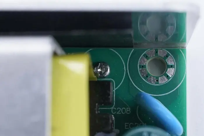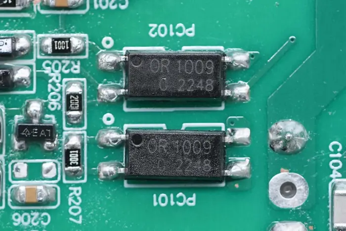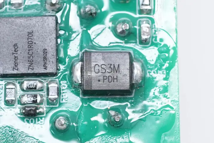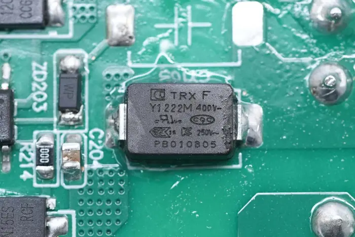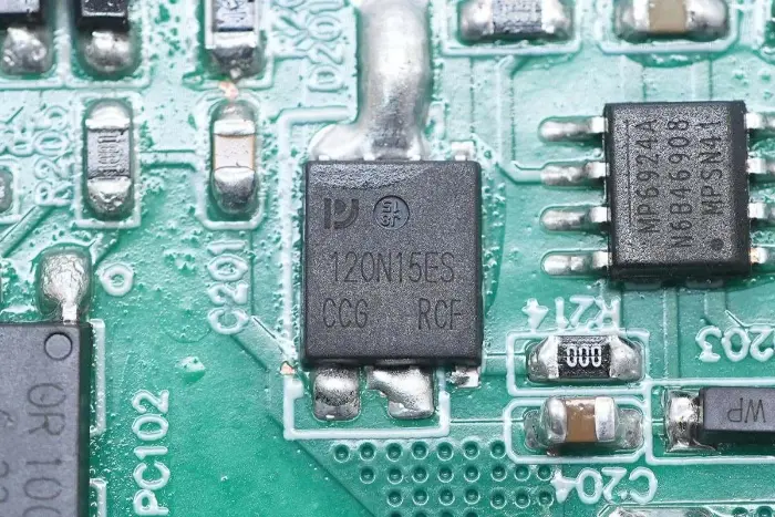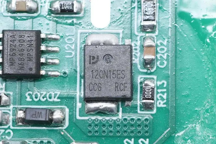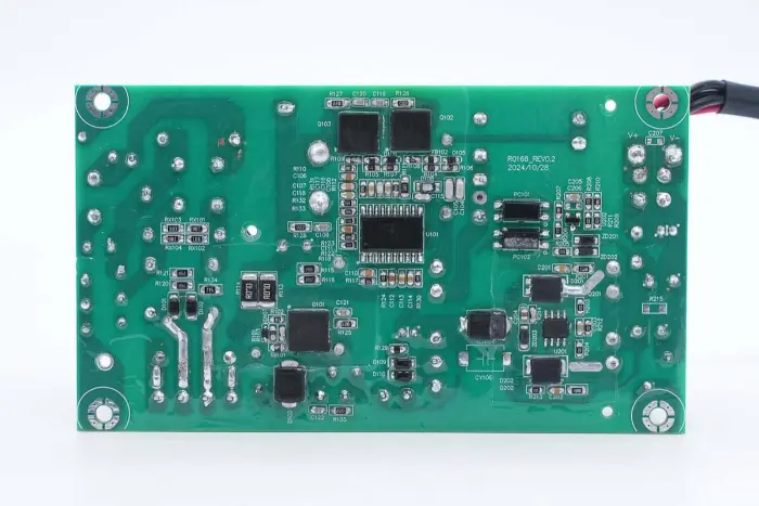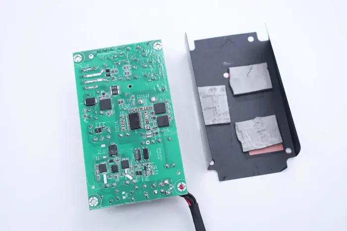 Na zadnji strani modula PCBA je krmilnik 2-v-1 PFC+LLC. Stikalo PFC se nahaja spodaj levo, stikalo LLC je nad glavnim krmilnim čipom, optični sklopnik s povratno informacijo je na desni, krmilnik sinhronega usmernika in dva sinhrona usmernika pa sta na dnu. Celotna plošča je prevlečena s konformnim premazom za zaščito.