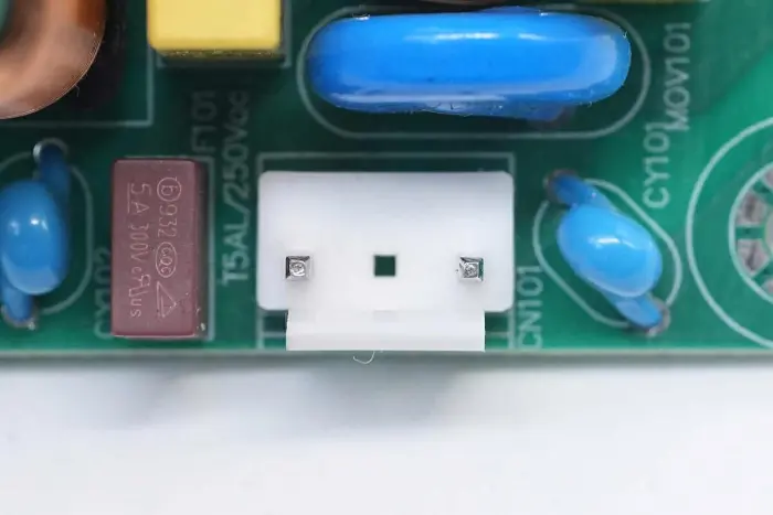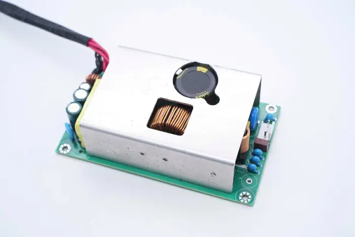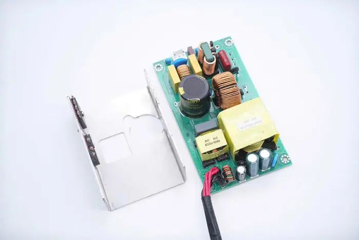 Pregled sprednje strani modula PCBA: leva stran je opremljena z vhodno vtičnico za napajanje, varovalko, kondenzatorjem Y, varistorjem, induktorjem skupnega načina in varnostnim kondenzatorjem X2. Srednji položaj je opremljen s PFC ojačevalnim induktorjem in visokonapetostnim filtrskim kondenzatorjem. Desna stran je opremljena z resonančnim kondenzatorjem LLC, resonančnim induktorjem, transformatorjem, filtrirnim kondenzatorjem in filtrirnim induktorjem.