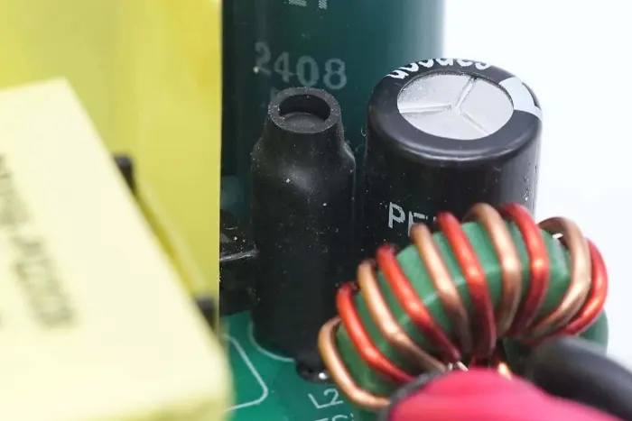 Ojačevalni induktor PFC je navit z magnetnim obročem, na dnu pa je za izolacijo bakelitna plošča.
