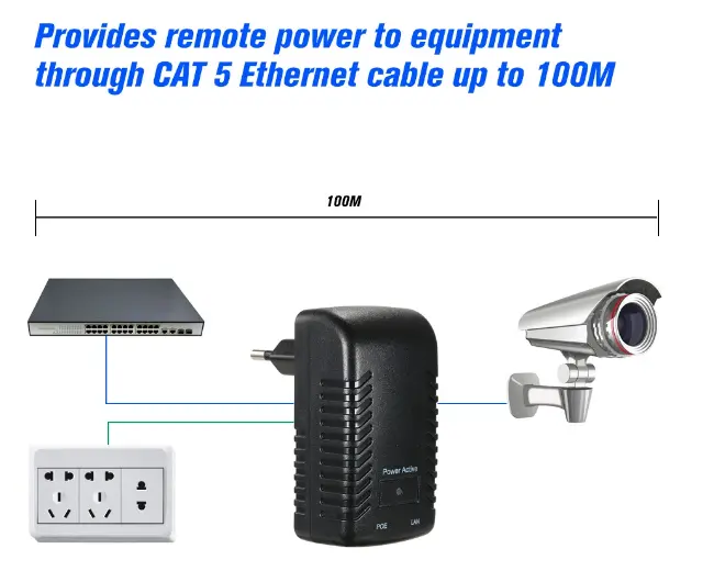 Ta nestandardni stenski ethernetni adapter, izdelan po standardu 48 V IEEE 802.3af, zagotavlja stabilno izhodno moč 15 W in v celoti podpira večino IP-kamer, ki jih napaja POE, ki običajno potrebujejo 15-25 W (razen modelov PTZ z visoko močjo). Zanesljivo deluje tudi z IP telefoni in drugimi napravami, ki so skladne s standardoma 802.3af ali 802.3at POE, ter ponuja široko združljivost, ki presega nastavitve nadzora. Zgrajen za stabilno dolgoročno delovanje, Wall Plug POE Injector združuje napajanje in prenos podatkov prek enega samega ethernetnega kabla, kar skrajša čas namestitve in materialne stroške za stanovanjske, komercialne in varnostne omrežne projekte.